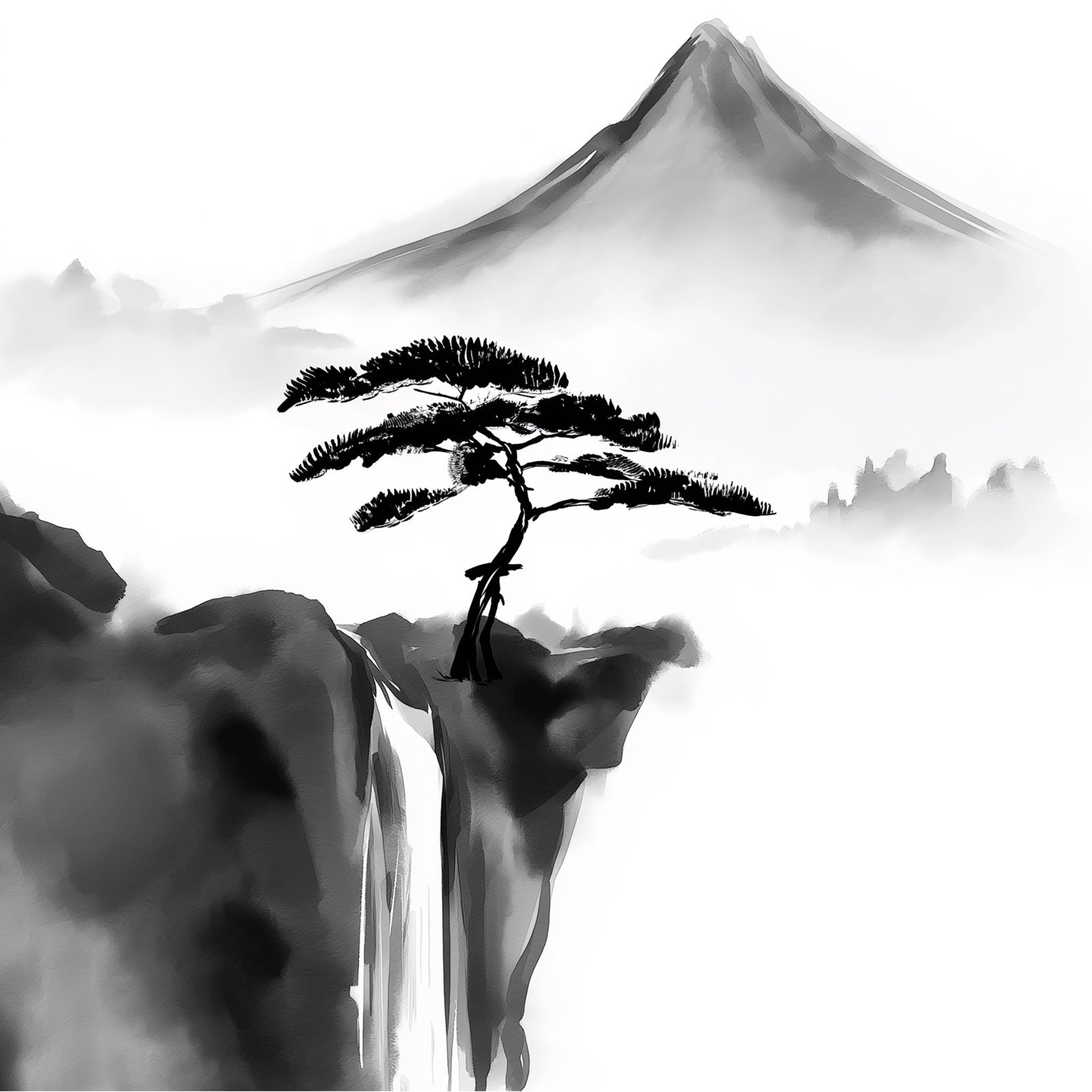 “Raiz do Silêncio” da Linha Square, é uma contemplação sobre equilíbrio e permanência. A obra retrata um pinheiro solitário, fincado à beira de um abismo nebuloso, com uma montanha ao fundo que se ergue como guardiã silenciosa do tempo. O preto e branco da composição evoca calma, profundidade e introspecção.