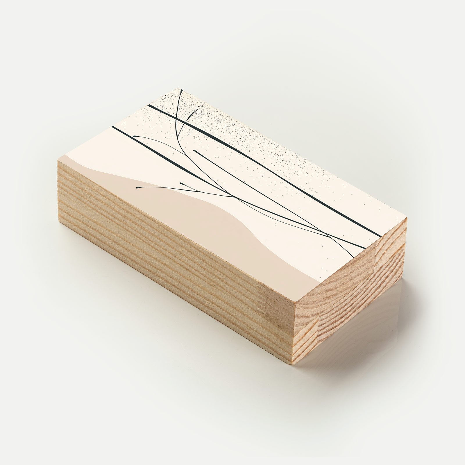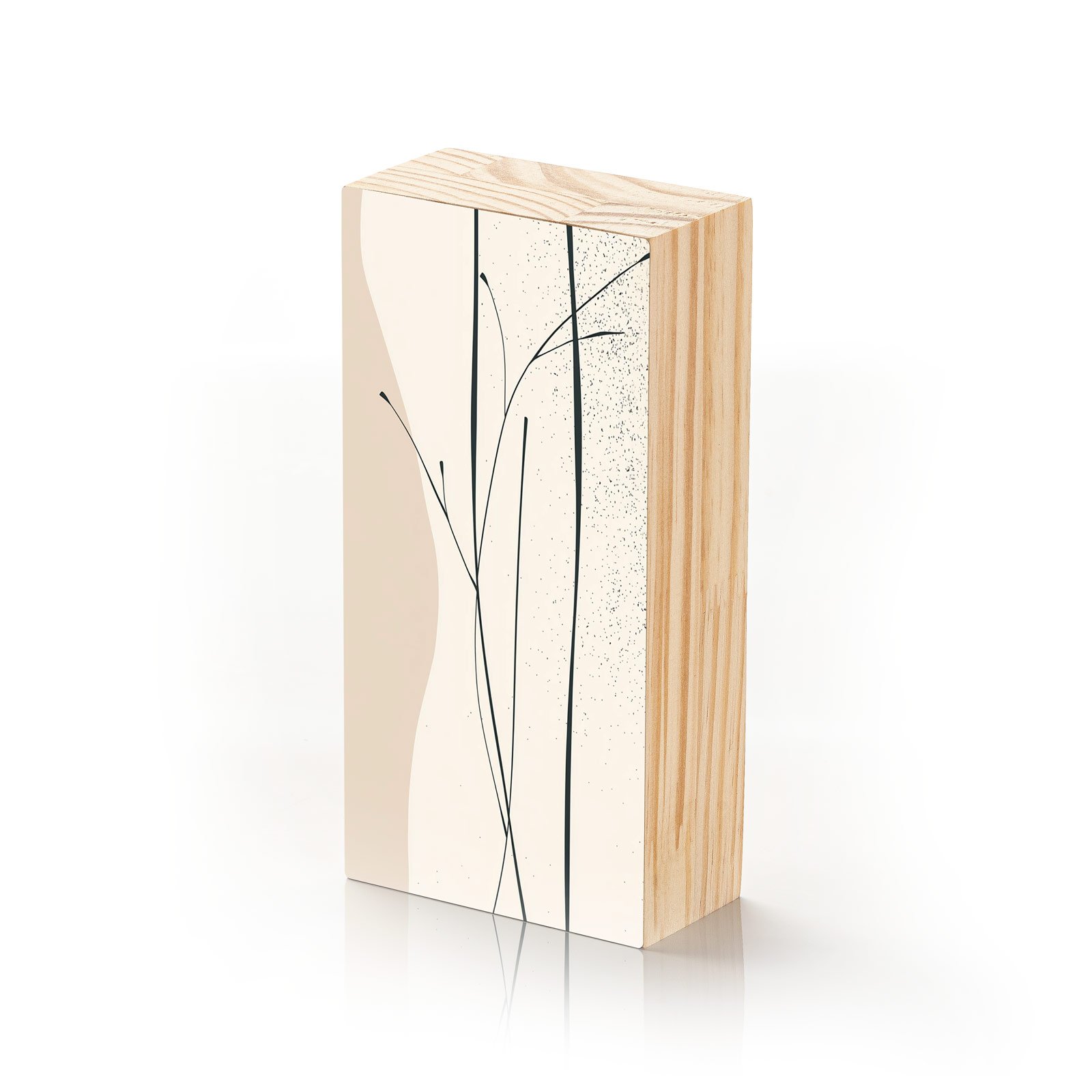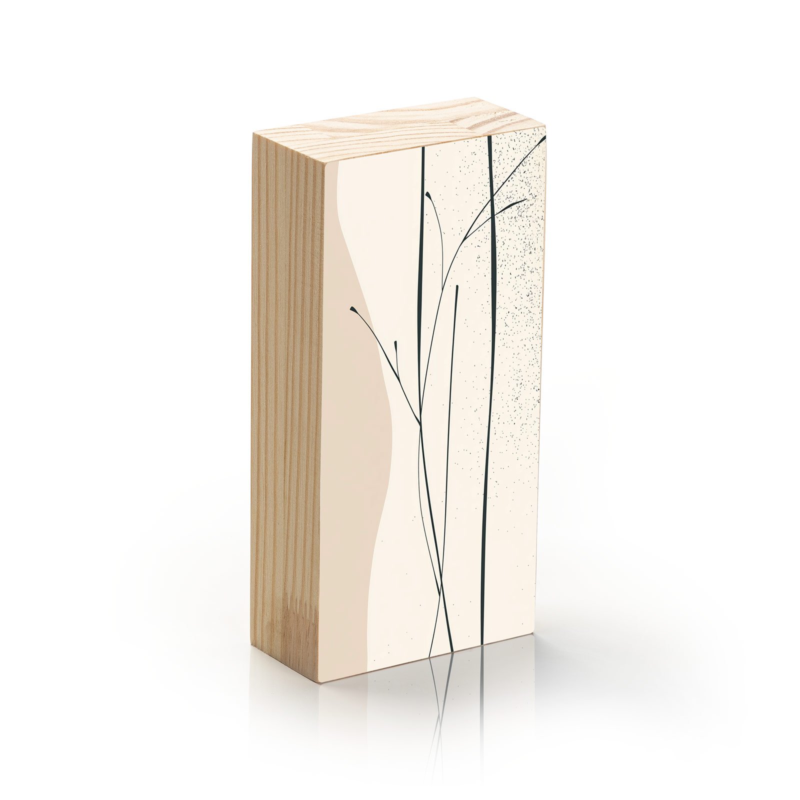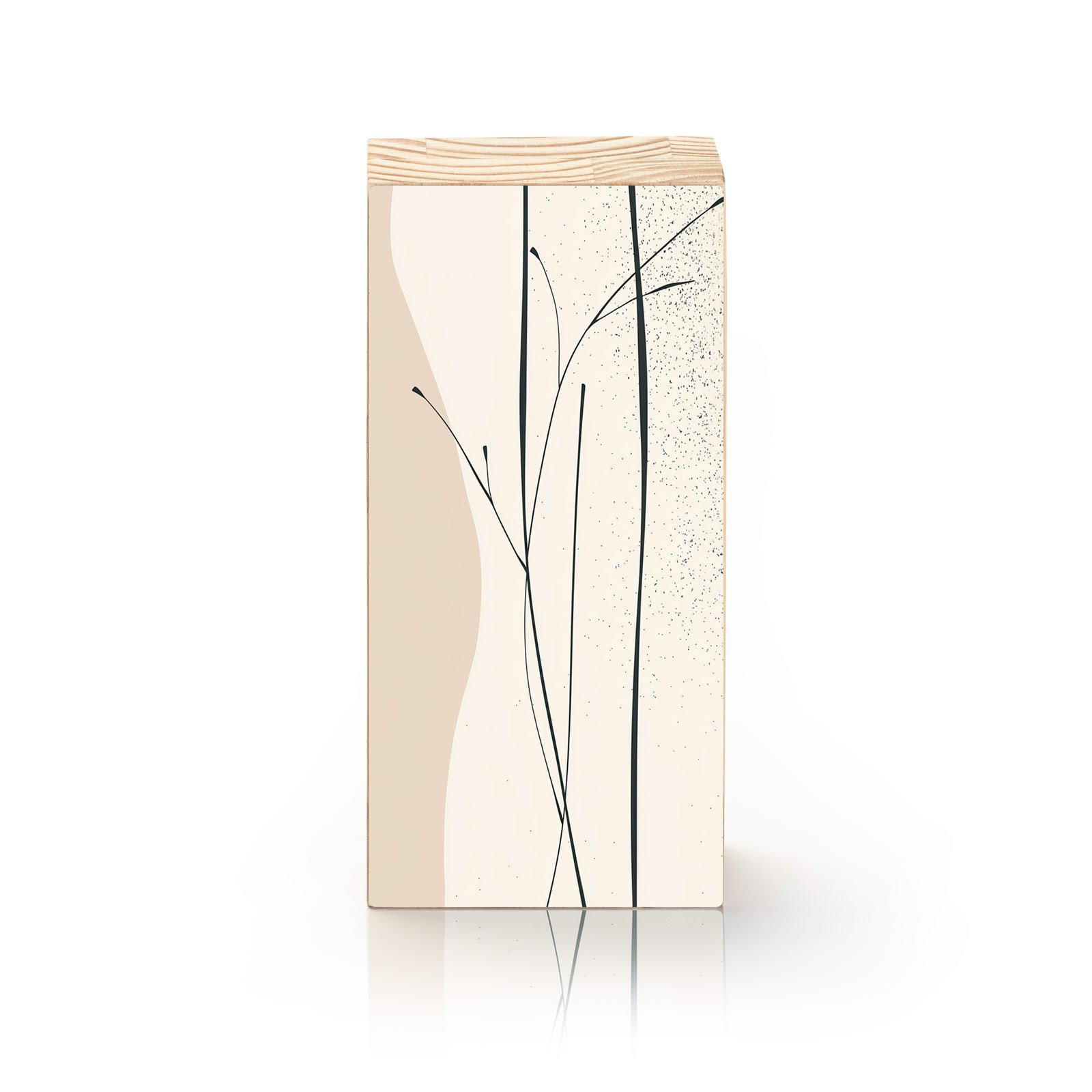 A arte apresenta ramos finos e longilíneos que se erguem suavemente sobre um fundo em tons de areia e bege claro. As linhas pretas curvas contrastam com a paleta neutra e ganham ainda mais destaque com pontos de textura pontilhada. O movimento sutil das hastes remete ao vento leve que atravessa um campo tranquilo, trazendo frescor e simplicidade à composição. É uma imagem silenciosa e refinada, que fala de calma e presença.