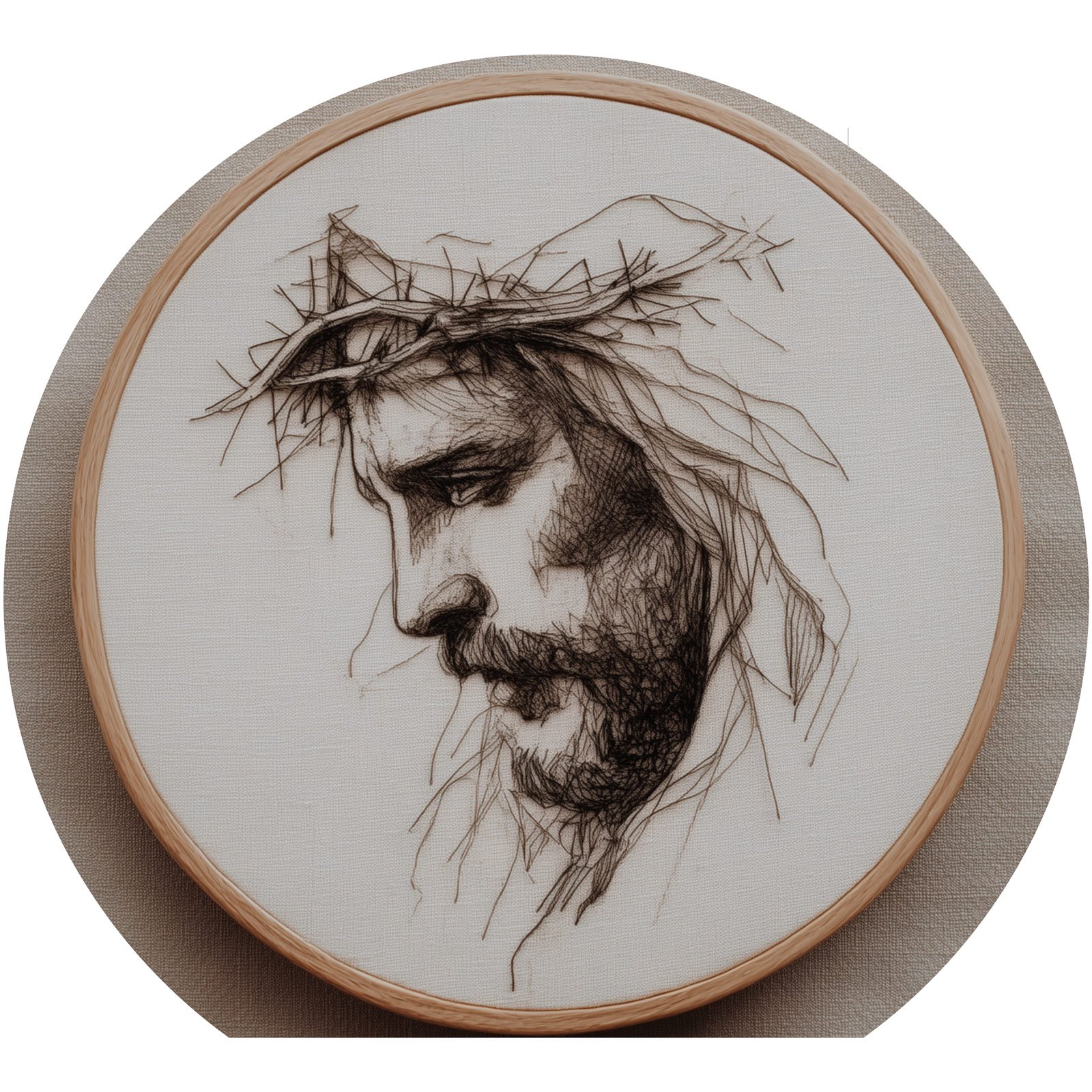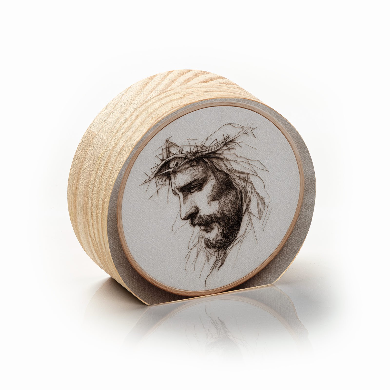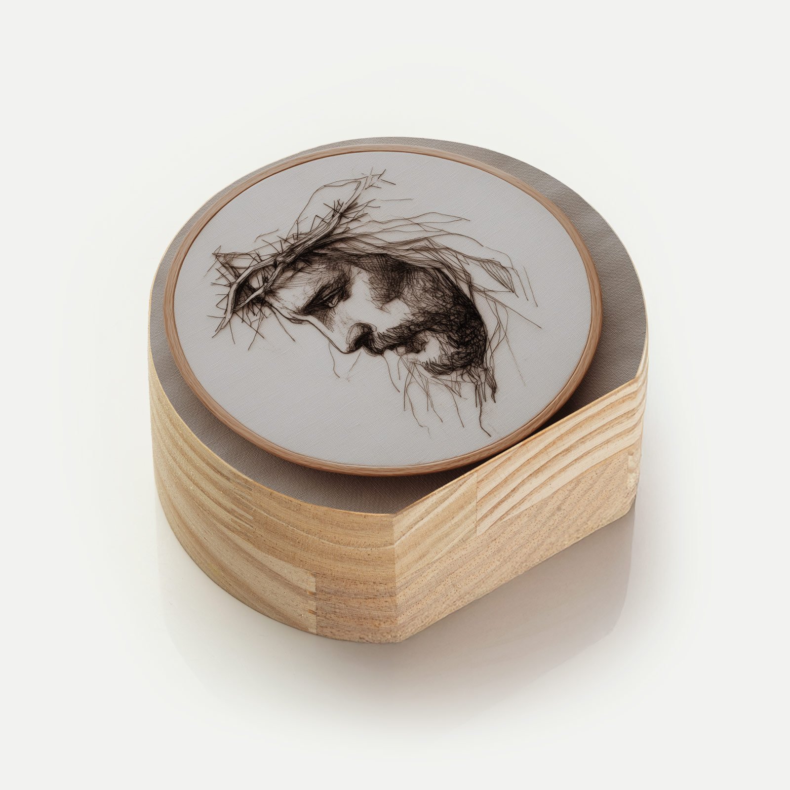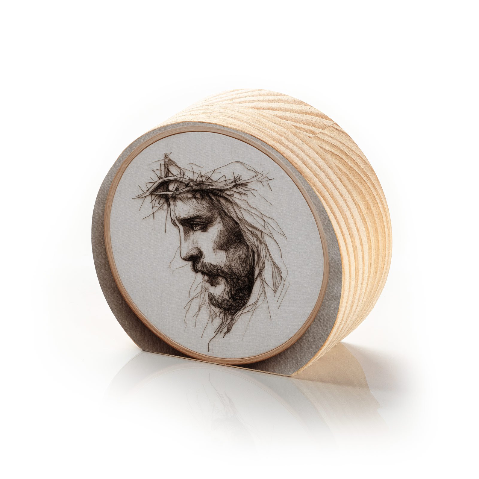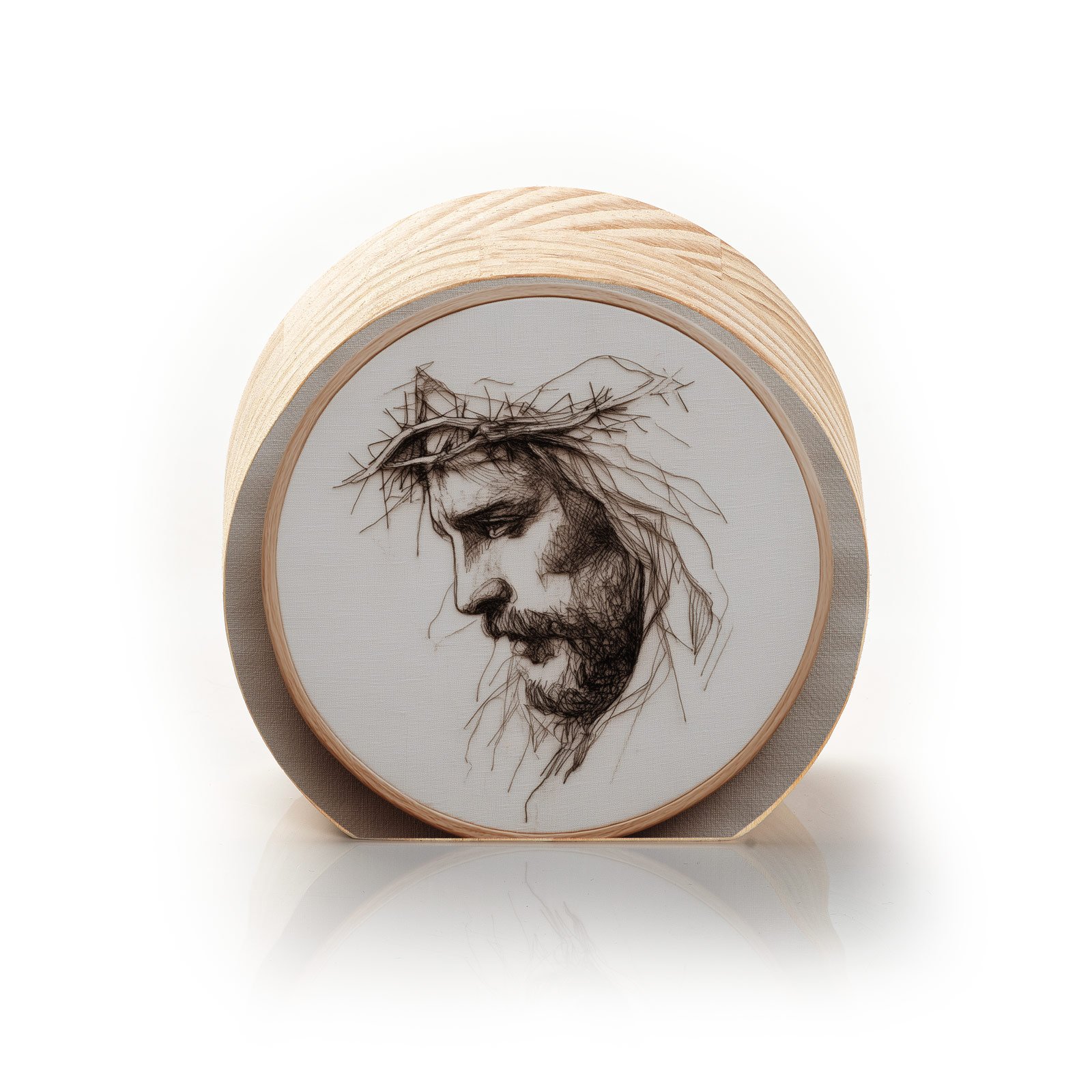 “Redentor em Silêncio” da Linha Luna, é uma peça que convida à introspecção e à fé serena. Com traços suaves e profundos em tom sépia, essa ilustração de Jesus com coroa de espinhos transmite paz, compaixão e entrega. O formato circular da linha Luna intensifica o simbolismo da eternidade e da presença divina.