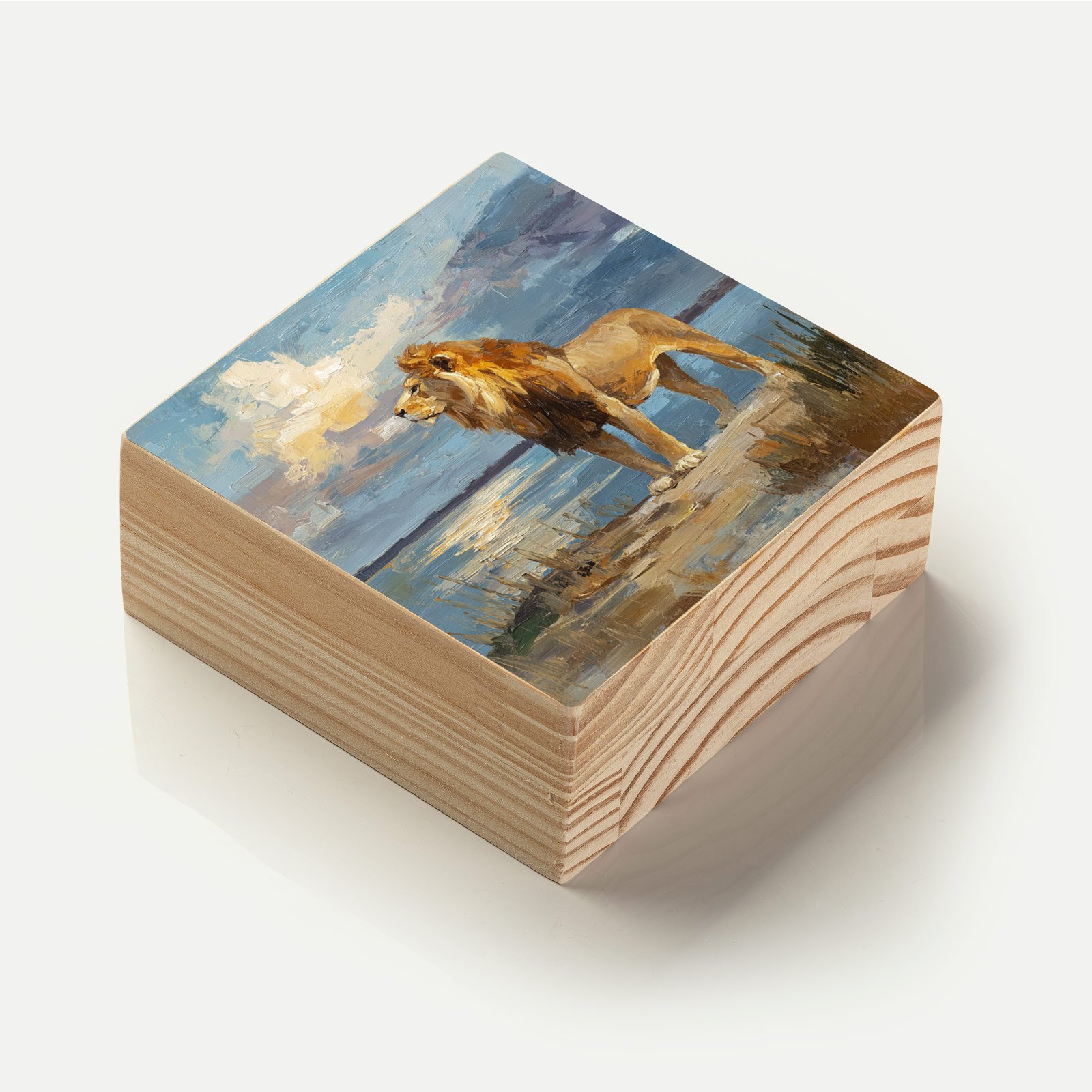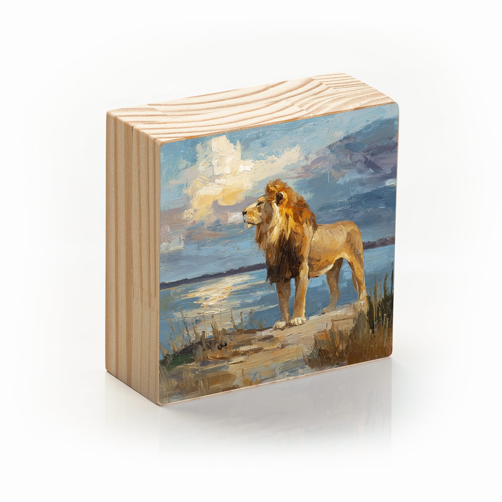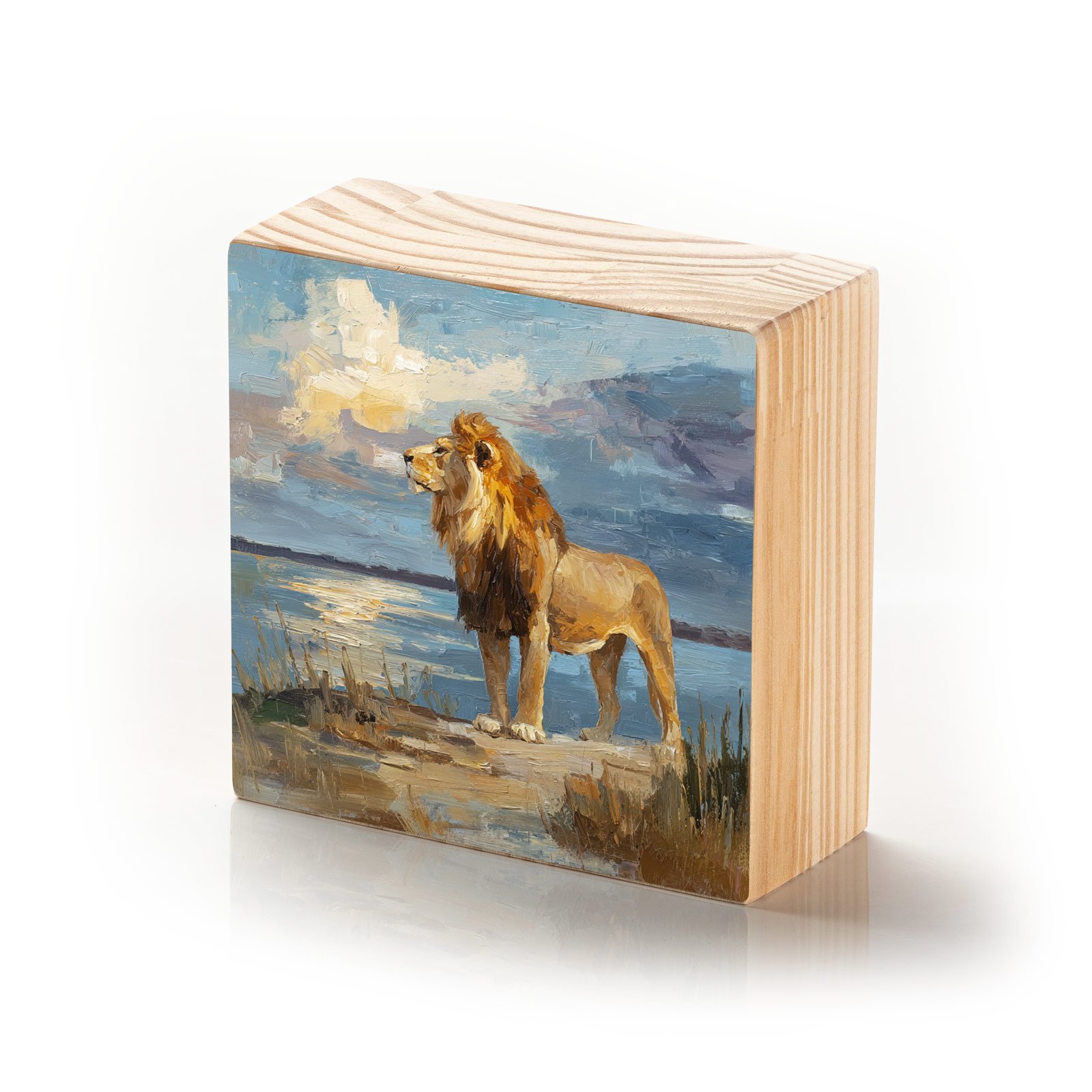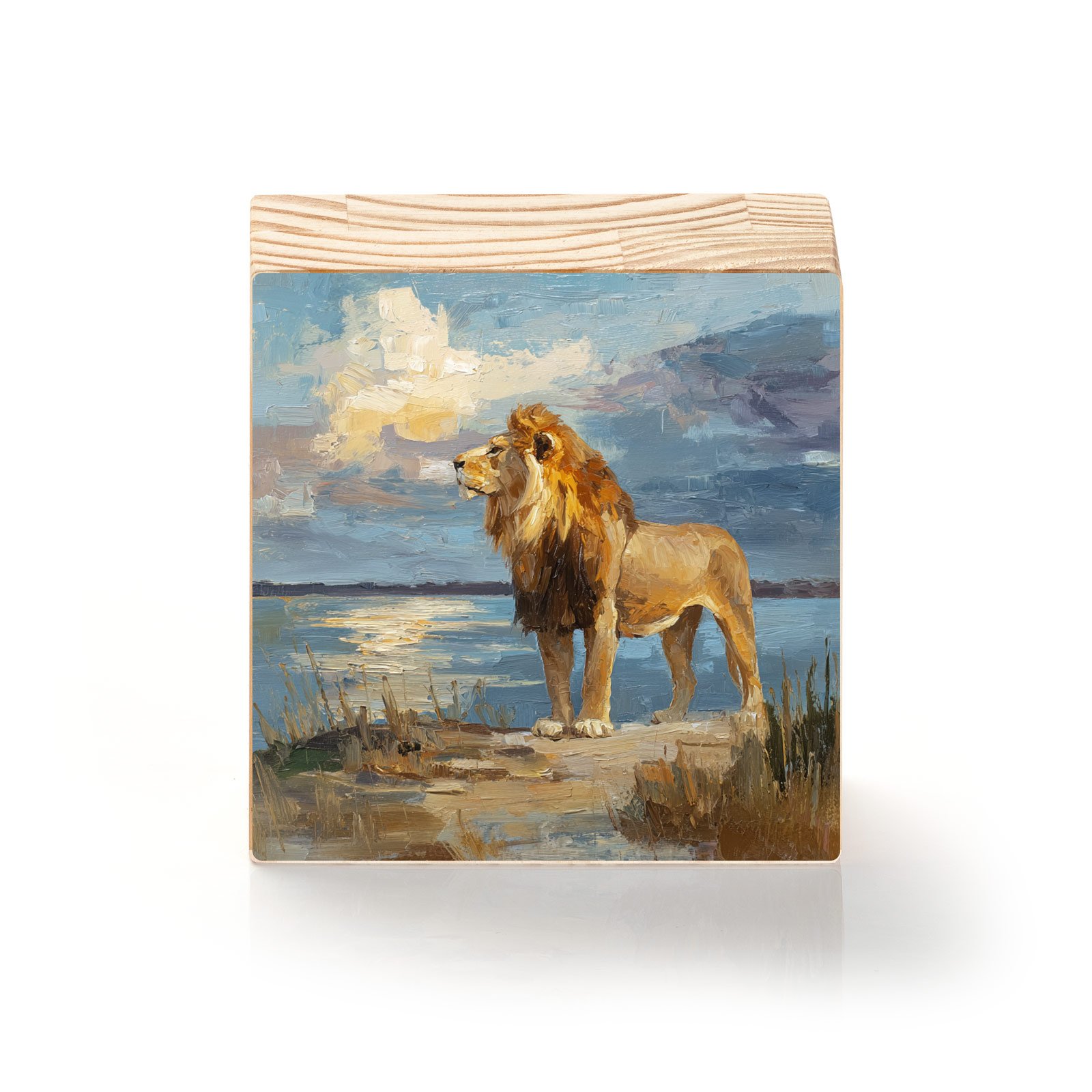 Há momentos em que o silêncio diz mais do que mil rugidos. O Totem Decorativo “Rei do Horizonte” da Linha Square, retrata um leão em contemplação solitária à beira de um lago, sob um céu de contrastes intensos. Uma cena que evoca coragem serena, presença e sabedoria silenciosa.