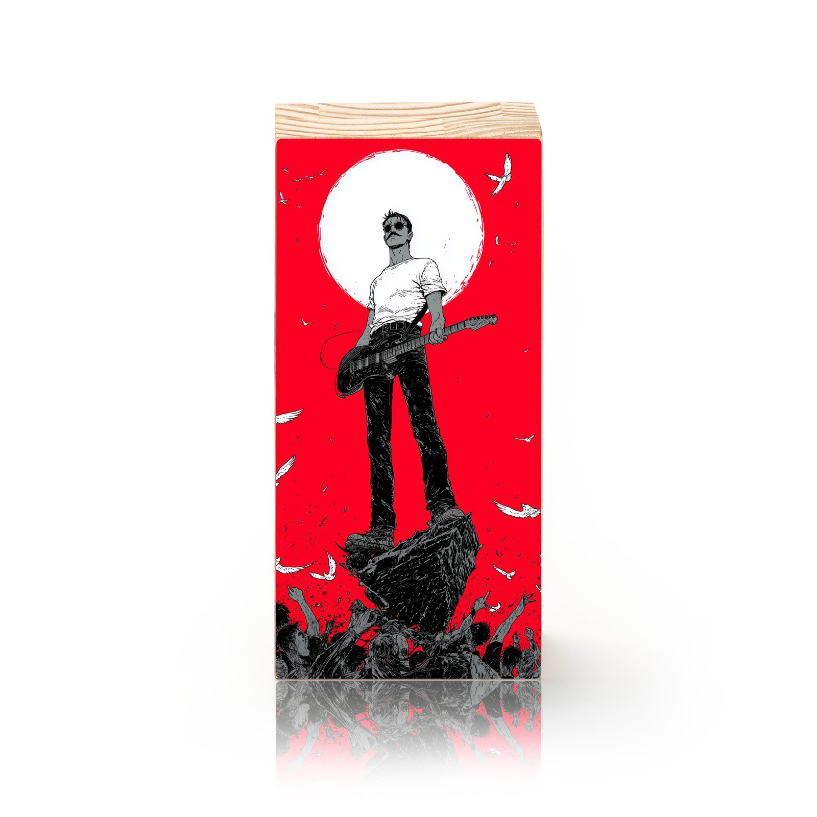 O “Rock Infinito” é uma explosão de energia visual que traduz o espírito rebelde e libertador da música. Em destaque, um guitarrista solitário se ergue sobre multidões, iluminado por um sol intenso que contrasta com o fundo vermelho vibrante — um manifesto visual da força transformadora do rock.