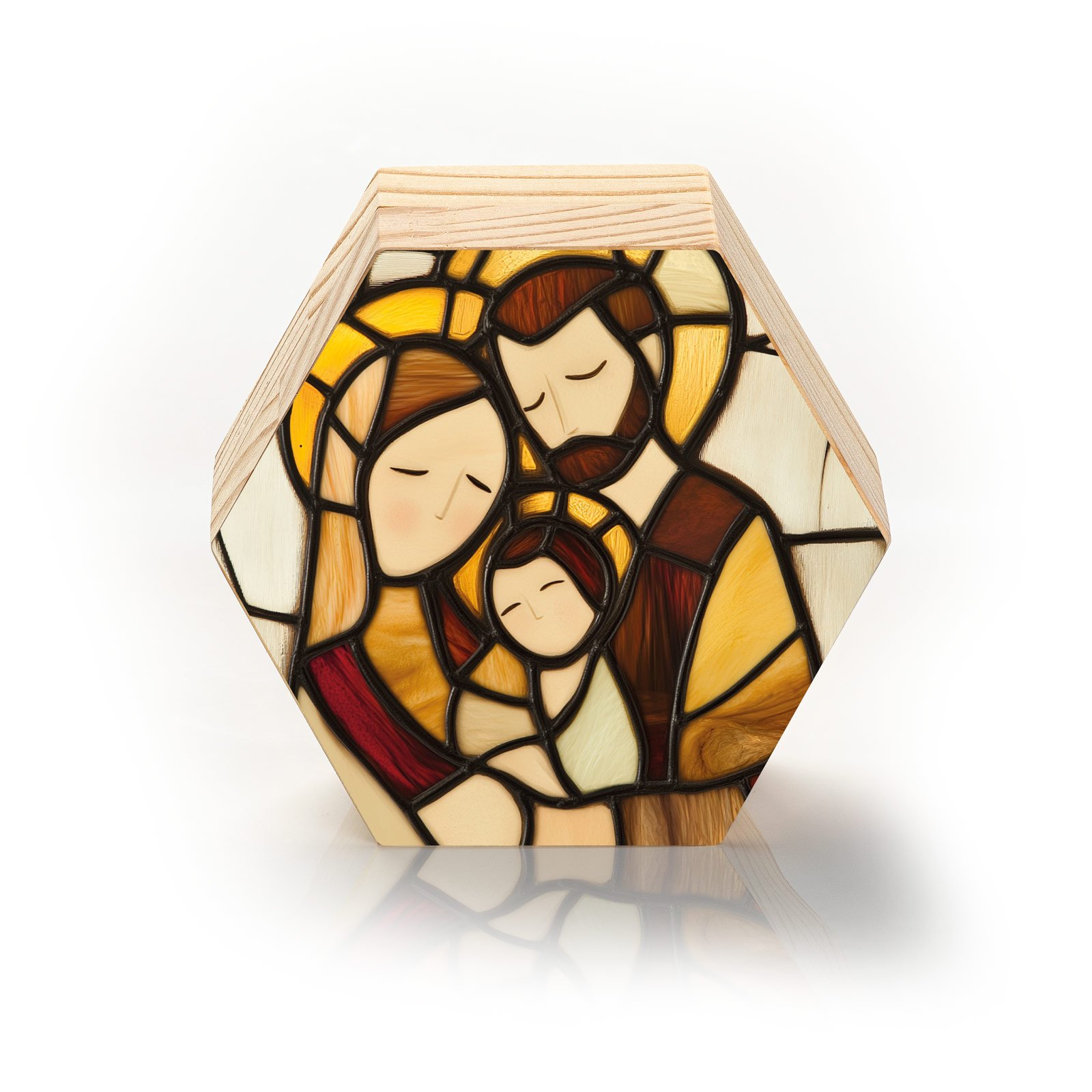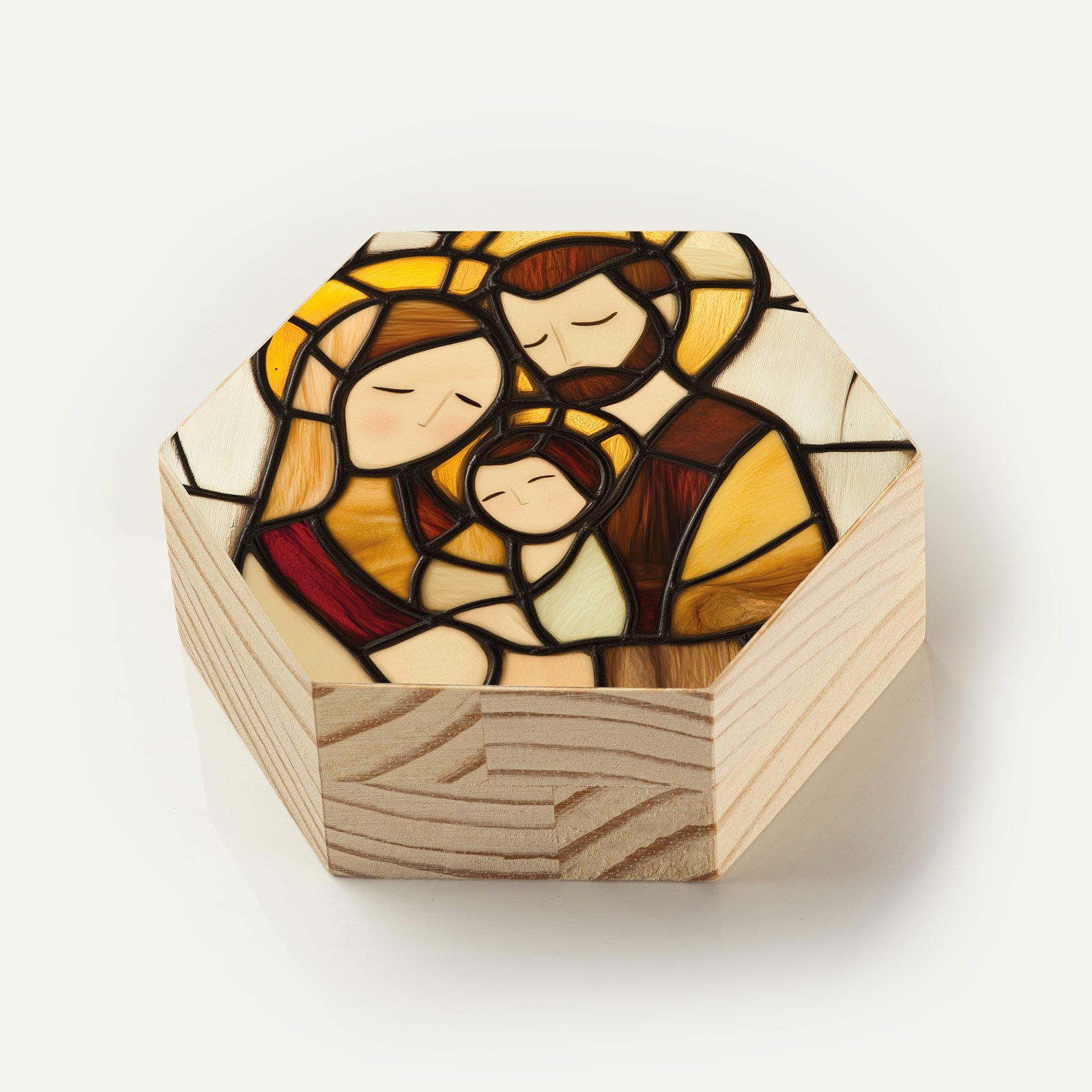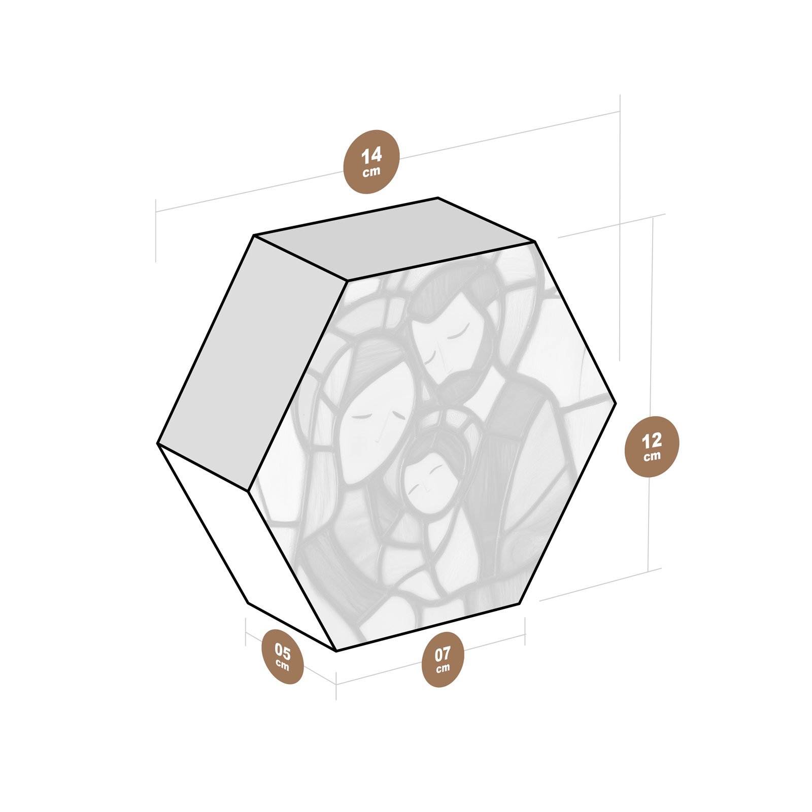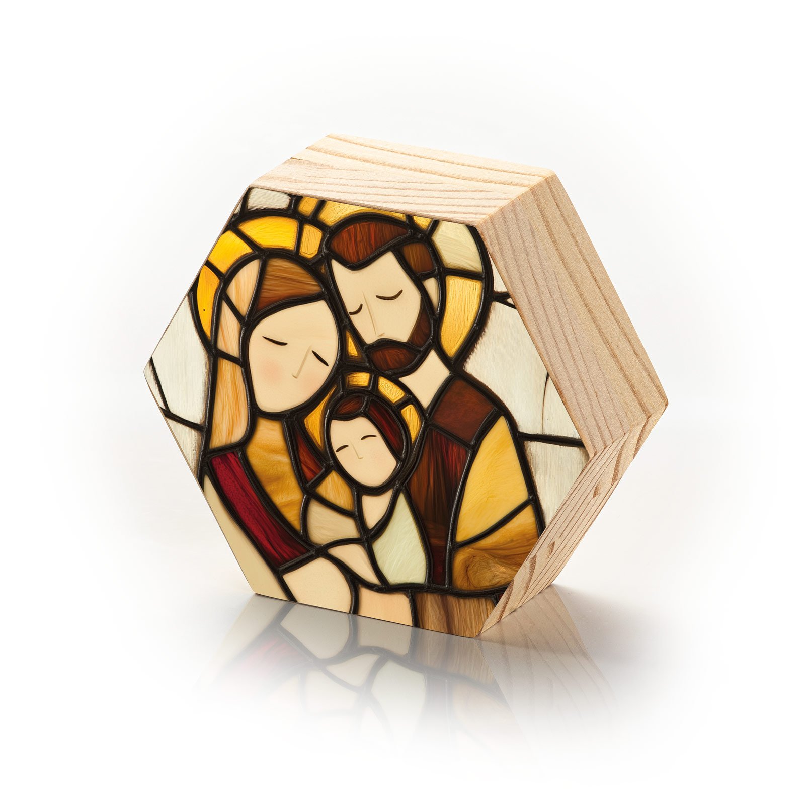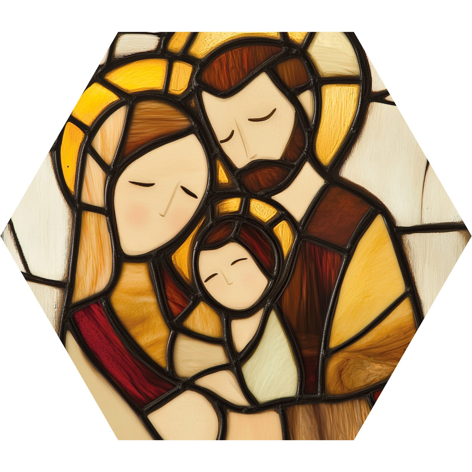 O design remete à união e proteção da família, com Maria, José e o Menino Jesus retratados com simplicidade e expressão de paz. A composição em estilo vitral traz um efeito visual encantador, perfeito para ambientes de oração, salas, escritórios ou como presente especial.