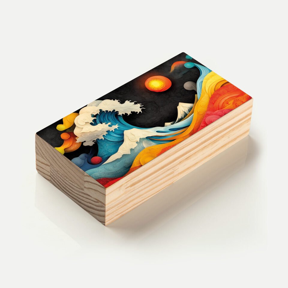 - Material: madeira pinus natural com impressão Fine Art e acabamento em metacrilato;