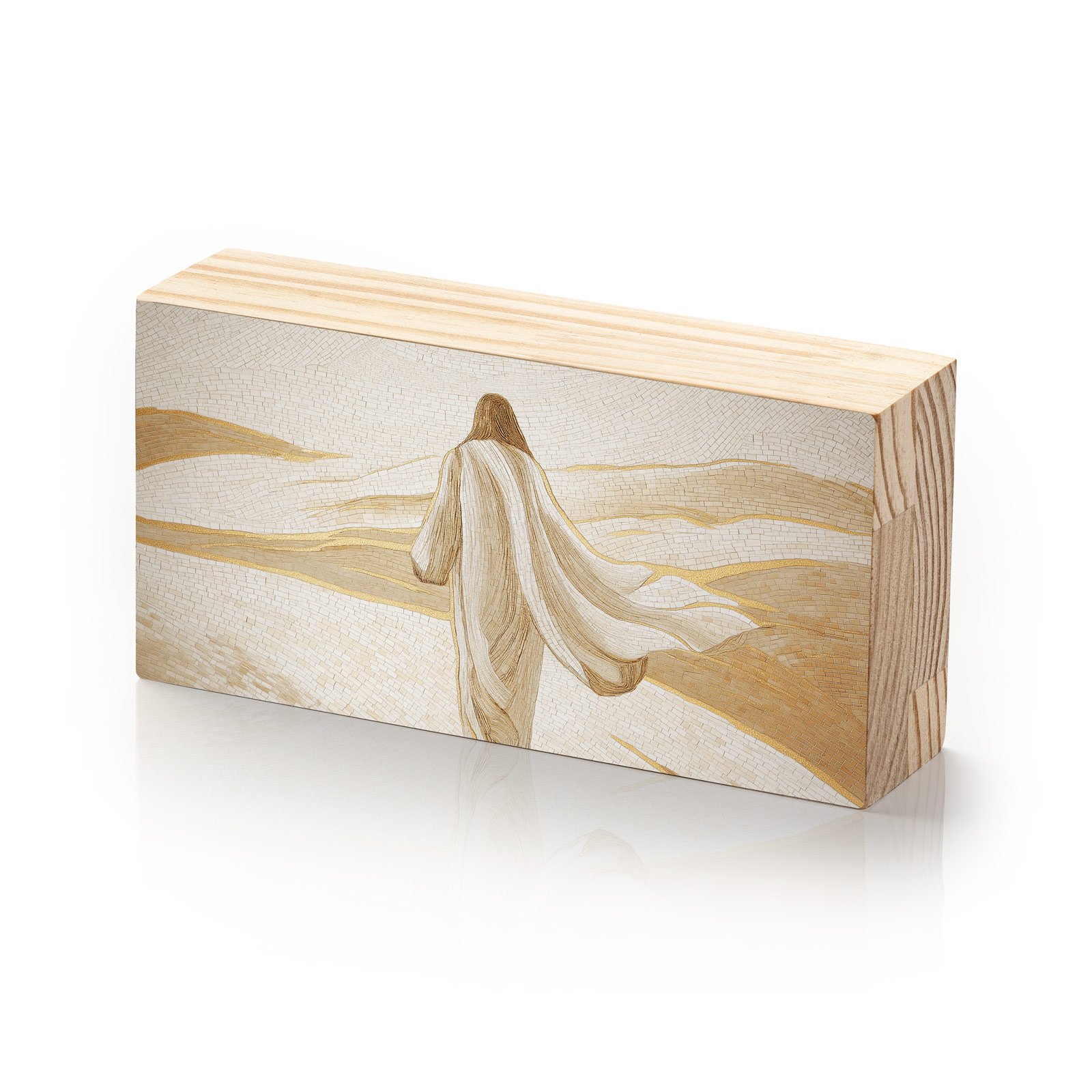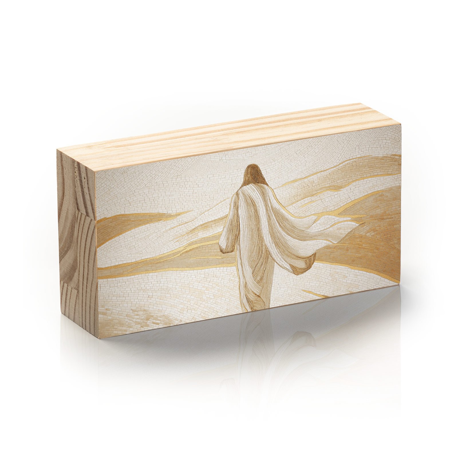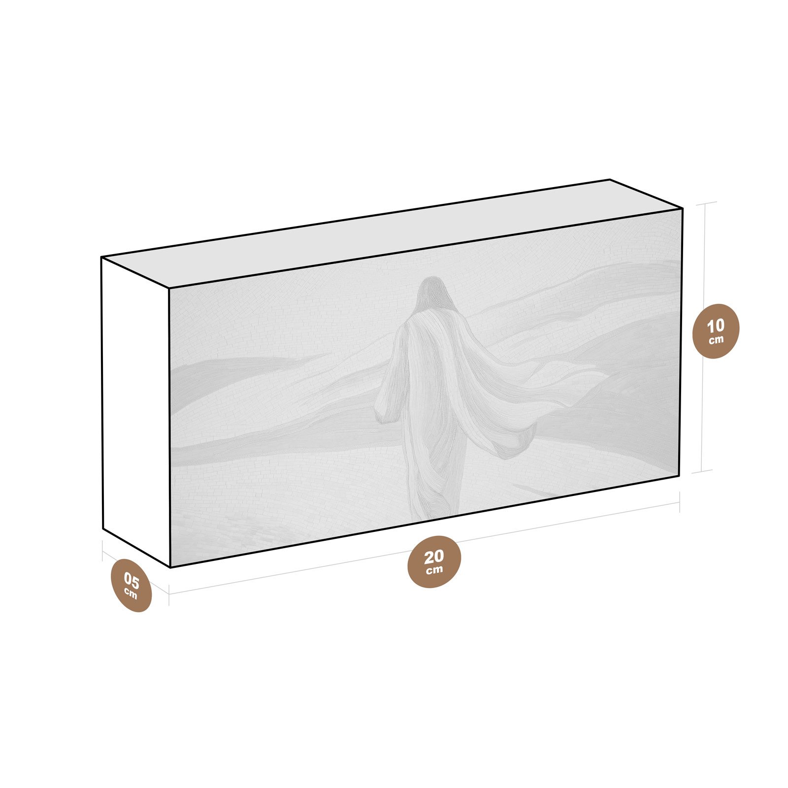 No vasto silêncio dourado do deserto, a figura de Cristo caminha envolta em serenidade, como quem segue em plena confiança. “Silêncio do Deserto” da Linha Horizon, é um símbolo de fé inabalável, de introspecção e da beleza que nasce nos momentos de solidão e entrega.