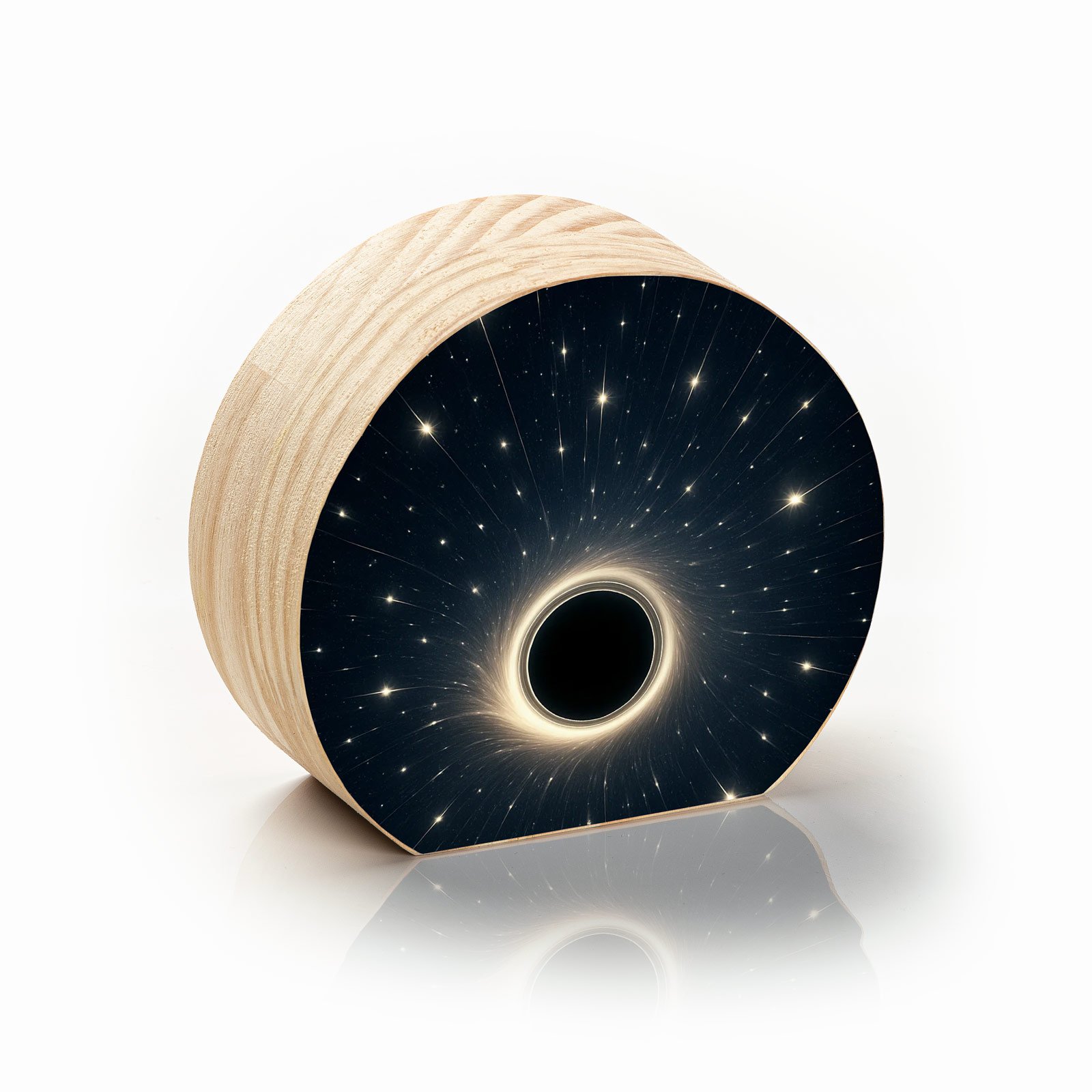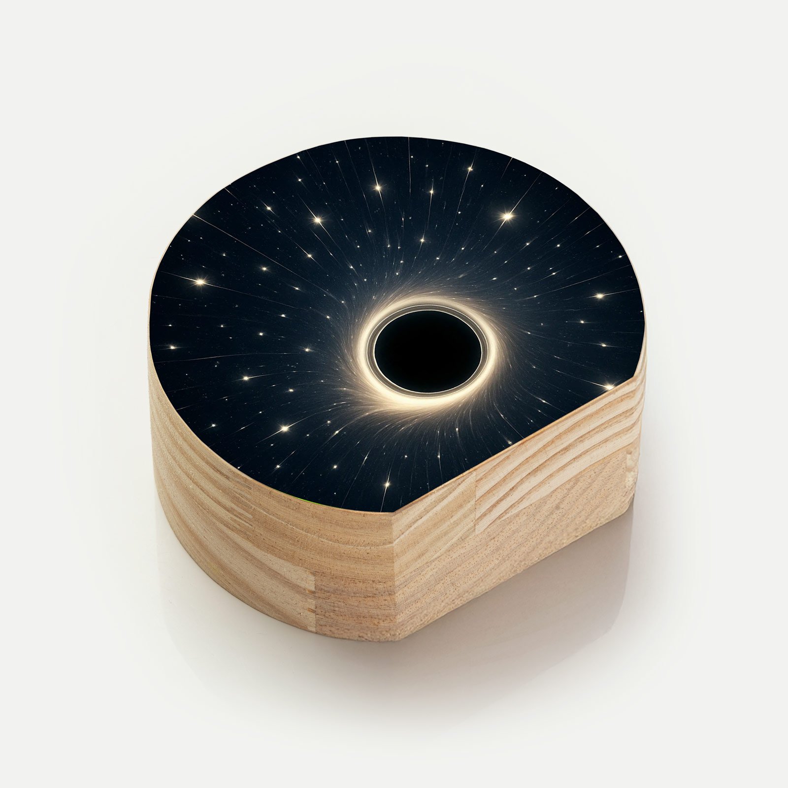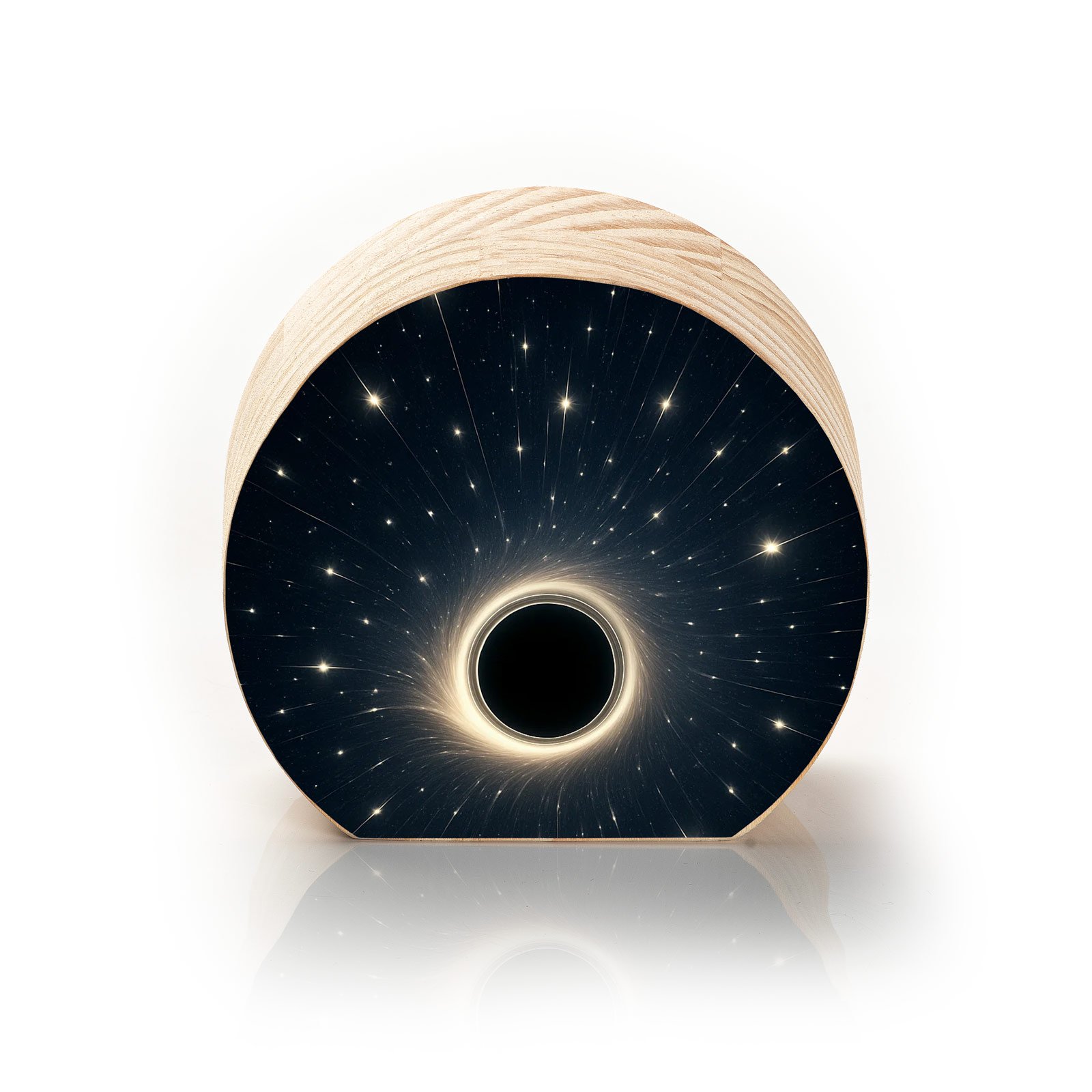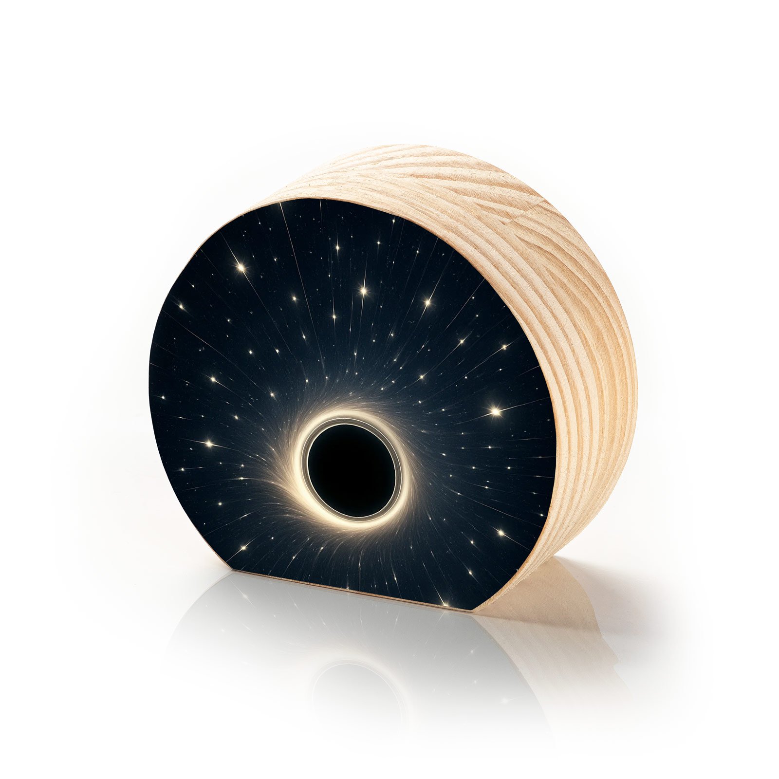 Este conceito monumental é apresentado em um contraste fascinante com a solidez e o calor da madeira natural. O totem ancora o mistério do universo em uma peça tangível e elegante, transformando um fenômeno astronômico em arte palpável.