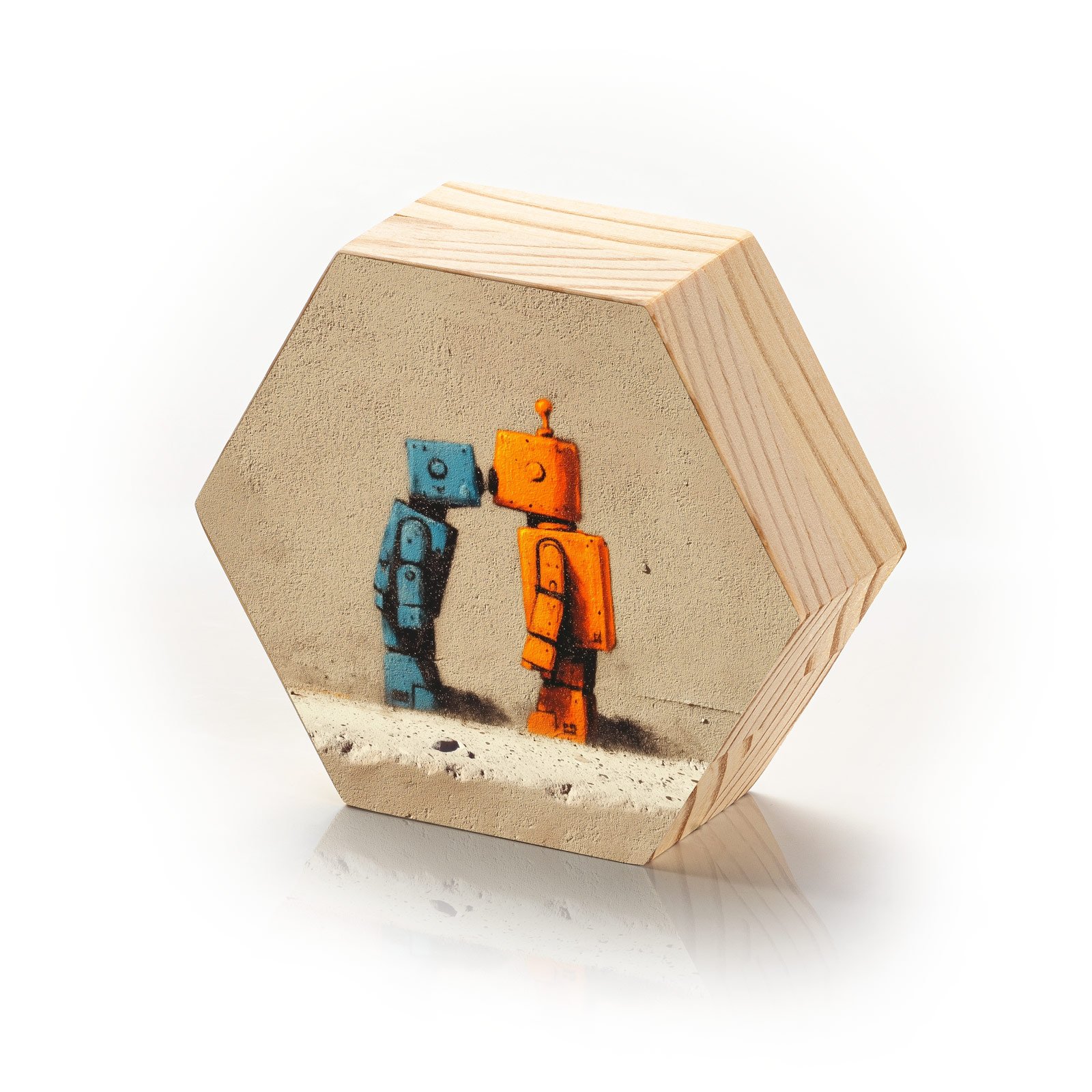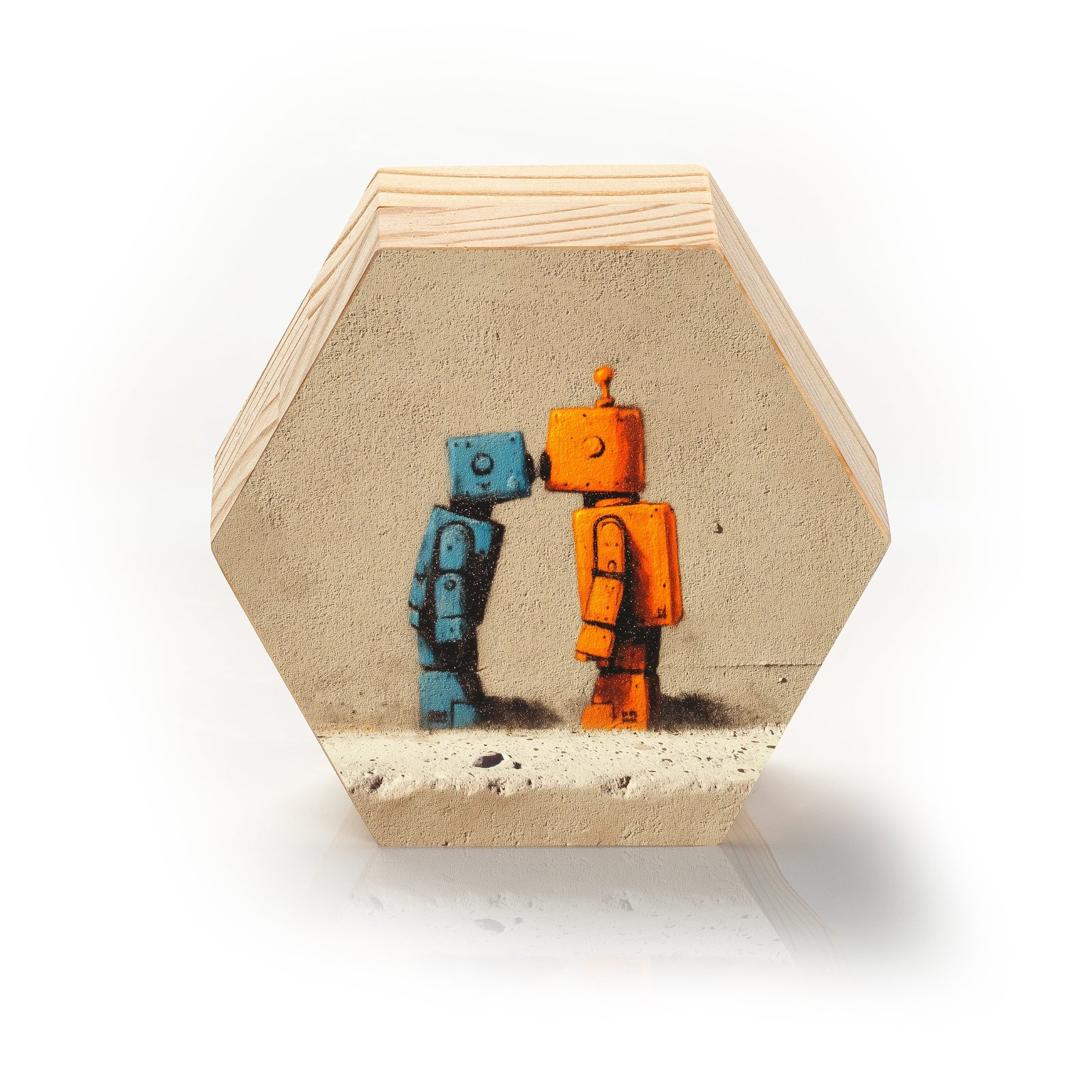 Dois robôs. Dois mundos. Um toque. A peça “Sintonia Robótica” Linha Hezag, apresenta um momento inusitado de ternura entre máquinas. Um beijo na testa entre um robô azul e um robô laranja em meio a um fundo de concreto remete à delicadeza possível até nas construções mais rústicas. Uma arte urbana com alma.