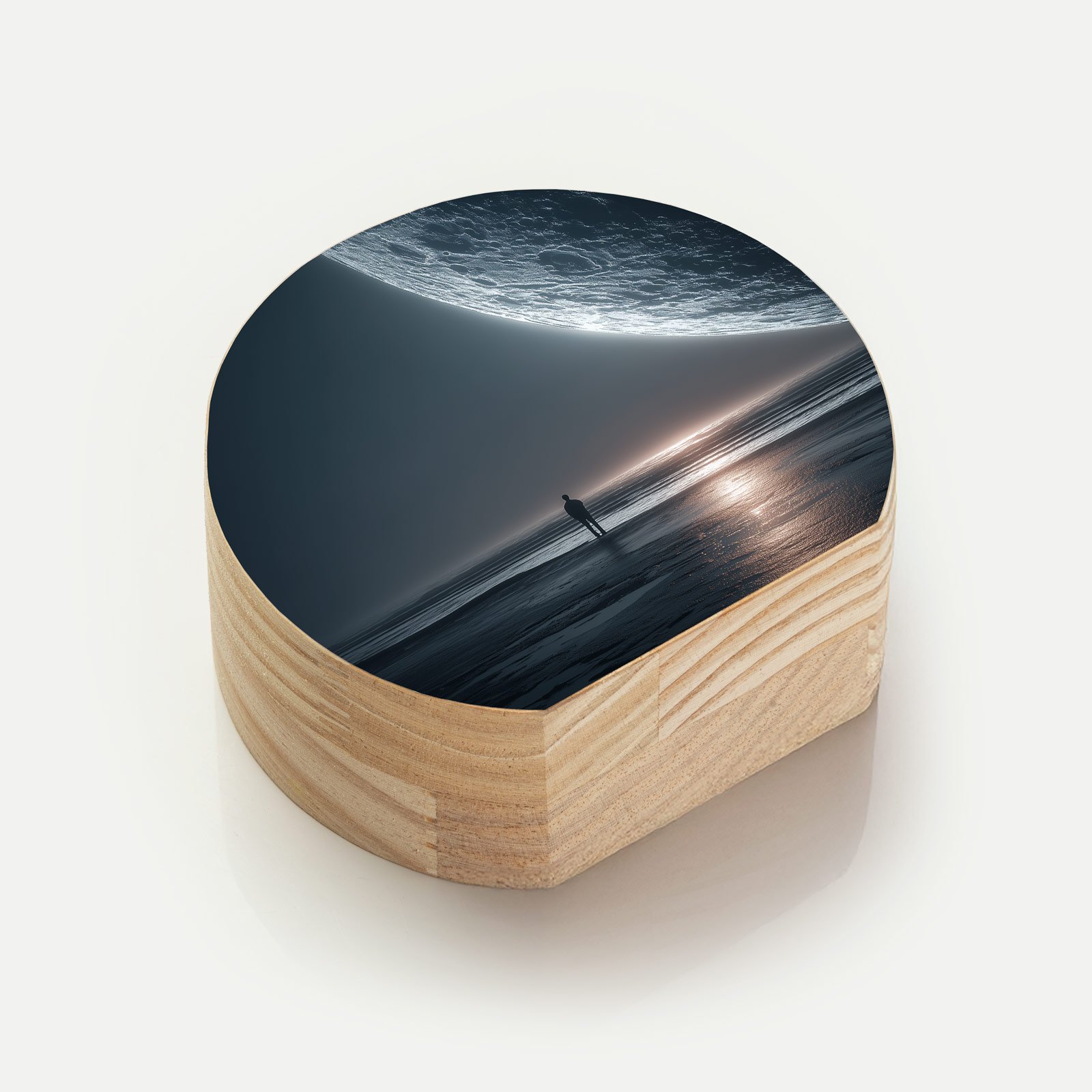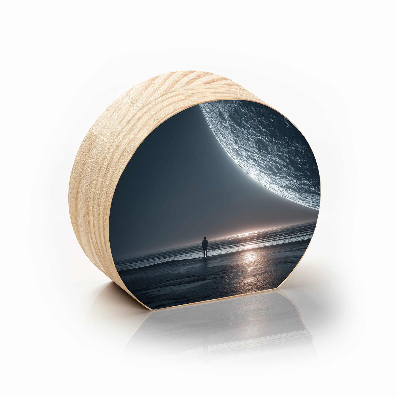 A imagem revela a pequenez humana diante da imensidão cósmica: uma figura solitária contempla o horizonte, onde a Lua surge em escala monumental sobre o mar noturno. “Sob o Colosso Lunar” é um convite à reflexão sobre a vastidão do universo e o mistério da existência.