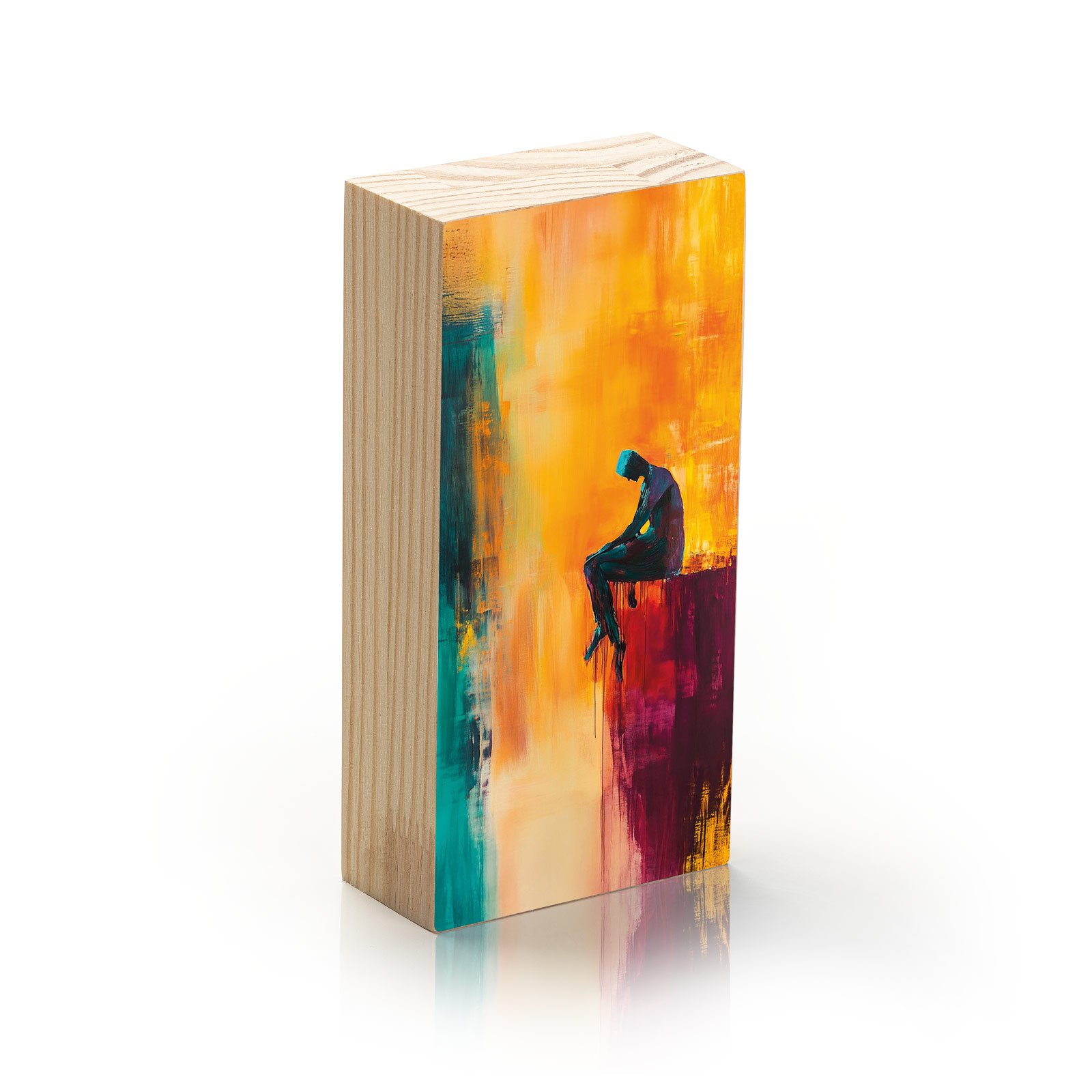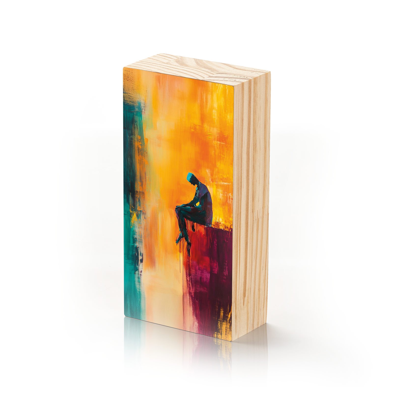 A obra retrata uma figura humana solitária sentada à beira de um bloco de cor, com cabeça curvada e postura melancólica. O fundo é uma explosão de tons vibrantes — laranja, magenta, turquesa e amarelo — em pinceladas expressivas que misturam movimento com profundidade emocional. O contraste entre a figura escura e o cenário colorido ressalta o isolamento e, ao mesmo tempo, a beleza do silêncio interior. É uma pintura que fala de solidão com cor e intensidade, trazendo camadas de significado.