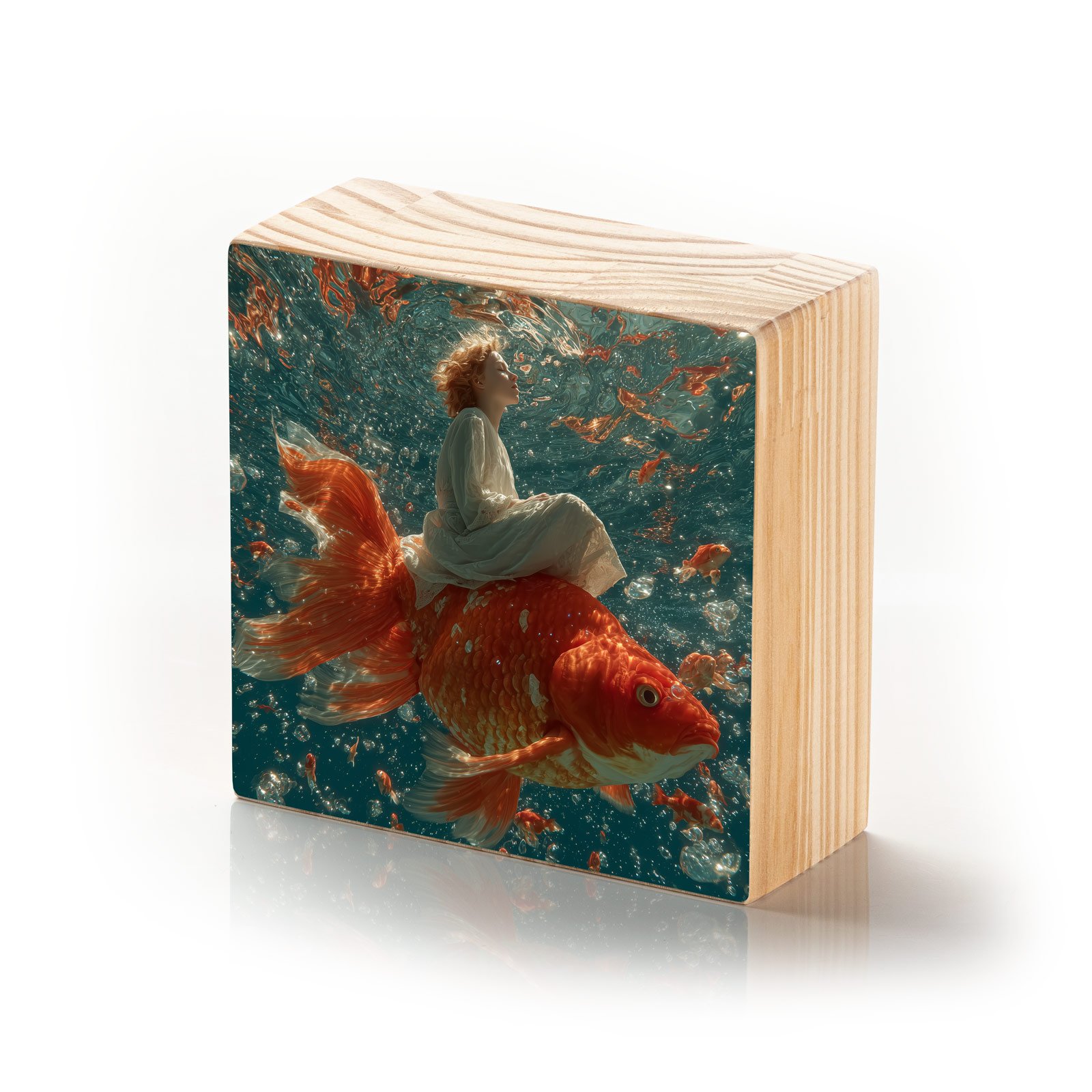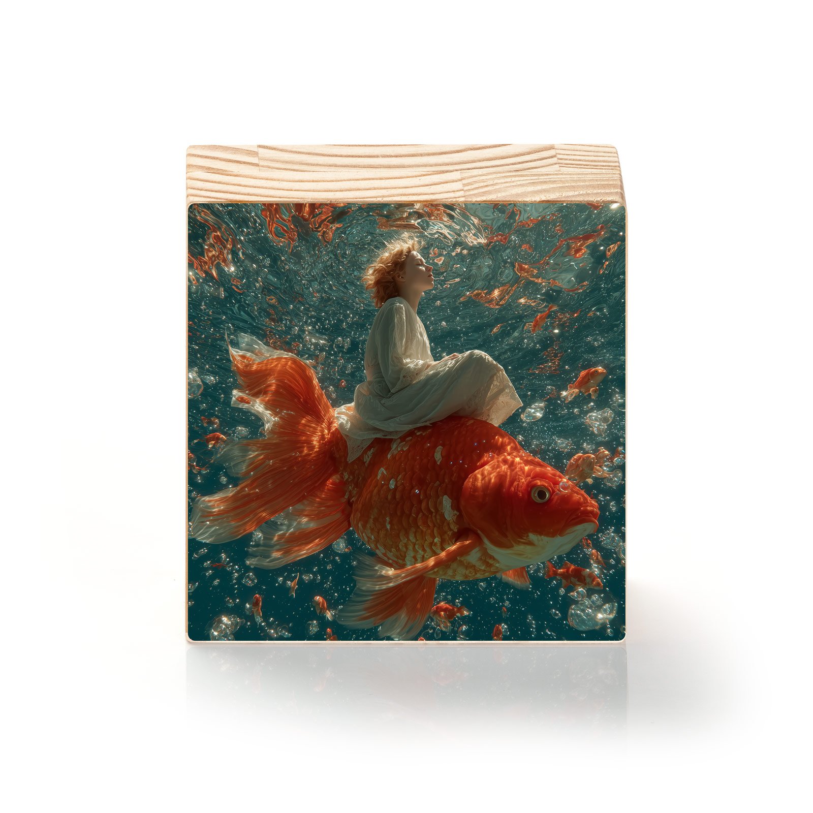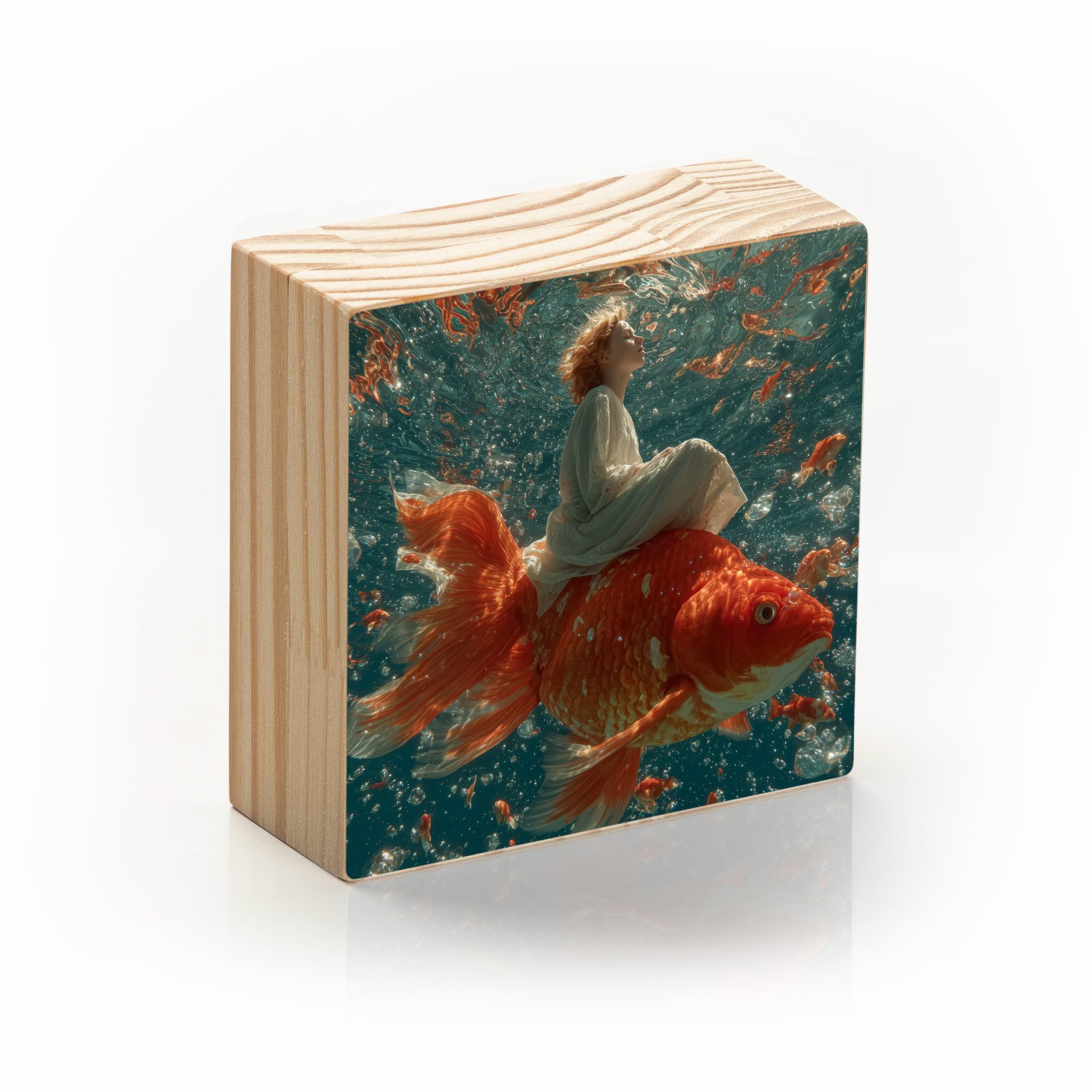 Um mergulho no impossível: “Sonho Submerso” traz a imagem mágica de uma criança que cavalga um imenso peixe-dourado em meio a águas cristalinas, cercada por cardumes cintilantes. A cena flutua entre a delicadeza e o surreal, evocando lembranças de sonhos que misturam inocência e aventura. Uma peça que desperta imaginação e encanta qualquer ambiente.