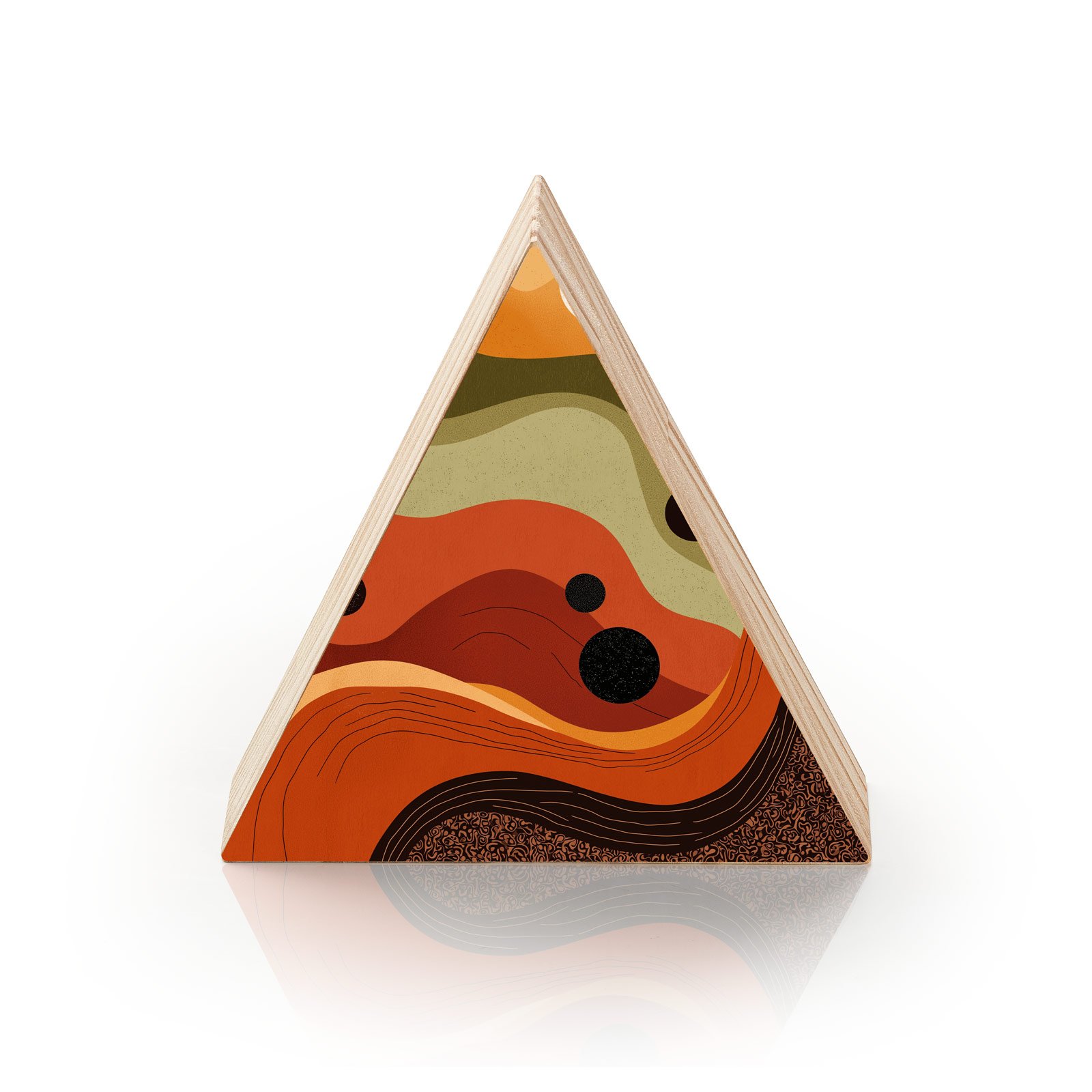 Com suas curvas fluidas e cores intensas, “Terras em Movimento” representa a força e a vitalidade do planeta em constante transformação. O contraste entre tons terrosos e detalhes circulares em preto simboliza equilíbrio entre natureza e cosmos, entre raízes e infinito.